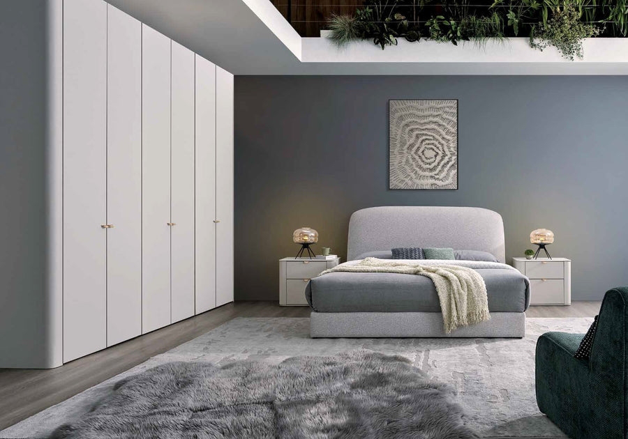 The wardrobe can be customized to seamlessly fit your space, complemented by stylish gold-accented handles for a touch of luxury. The graceful dresser features a softly illuminated circular mirror, while the versatile console and side tables provide elegant and functional storage solutions.