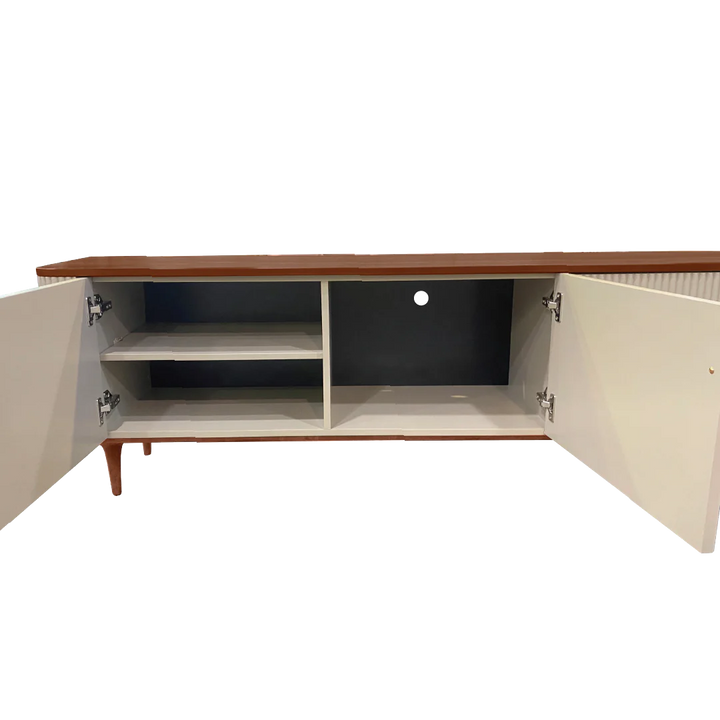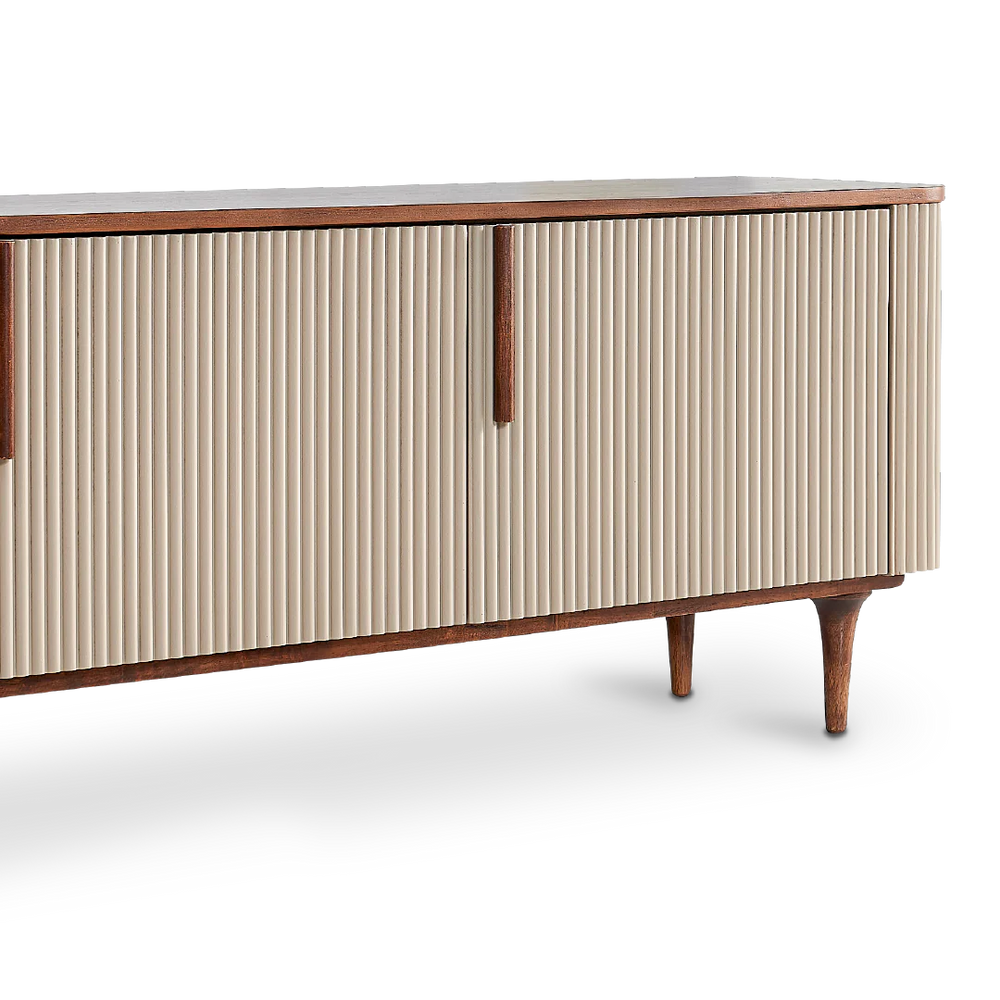 Bring timeless sophistication to your space with the Rivana Hall Cabinet, designed to blend warm tones and modern fluted textures. Crafted from a rich walnut veneer and high-grade MDF, the cabinet is supported by elegant solid rubberwood legs and matching vertical handles. Its ribbed façade creates depth and dimension, adding a refined touch to any interior. With three spacious soft-closing compartments, it offers stylish functionality—perfect for hallways, living areas, or as a statement sideboard.